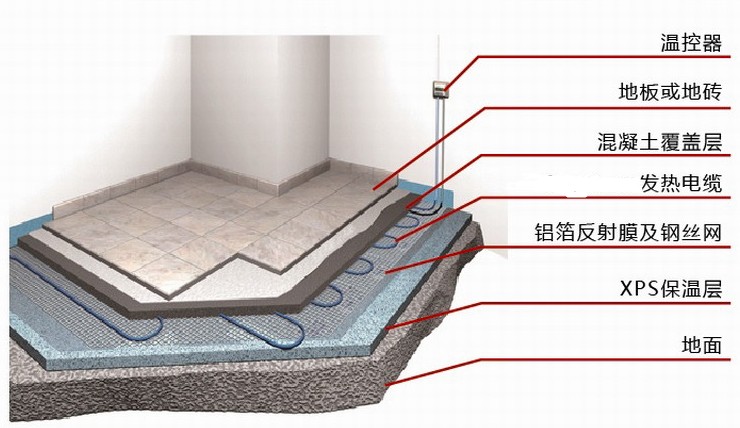 发热电缆地面辐射供暖系统以发热电缆为发热体,通电发热,以低温辐射的方式温暖整个房间。在实际安装的时候,有两种方式,湿式安装和干式安装。我们以安装比较多的方式—湿式安装方式为例。